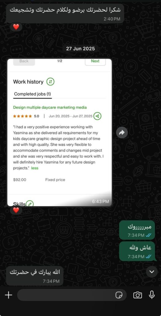 “أنا كنت بقالي شهور بحاول أشتغل على Upwork ومفيش قبول. بعد استشارة حسن، اكتشفت إن كل حاجة كنت بعملها غلط! من أول البروفايل لحد طريقة التقديم. بعد الجلسة بـ10 أيام، اشتغلت أول مشروع… ولسه مكملة! الجلسة فرقتلي حرفيًا.”